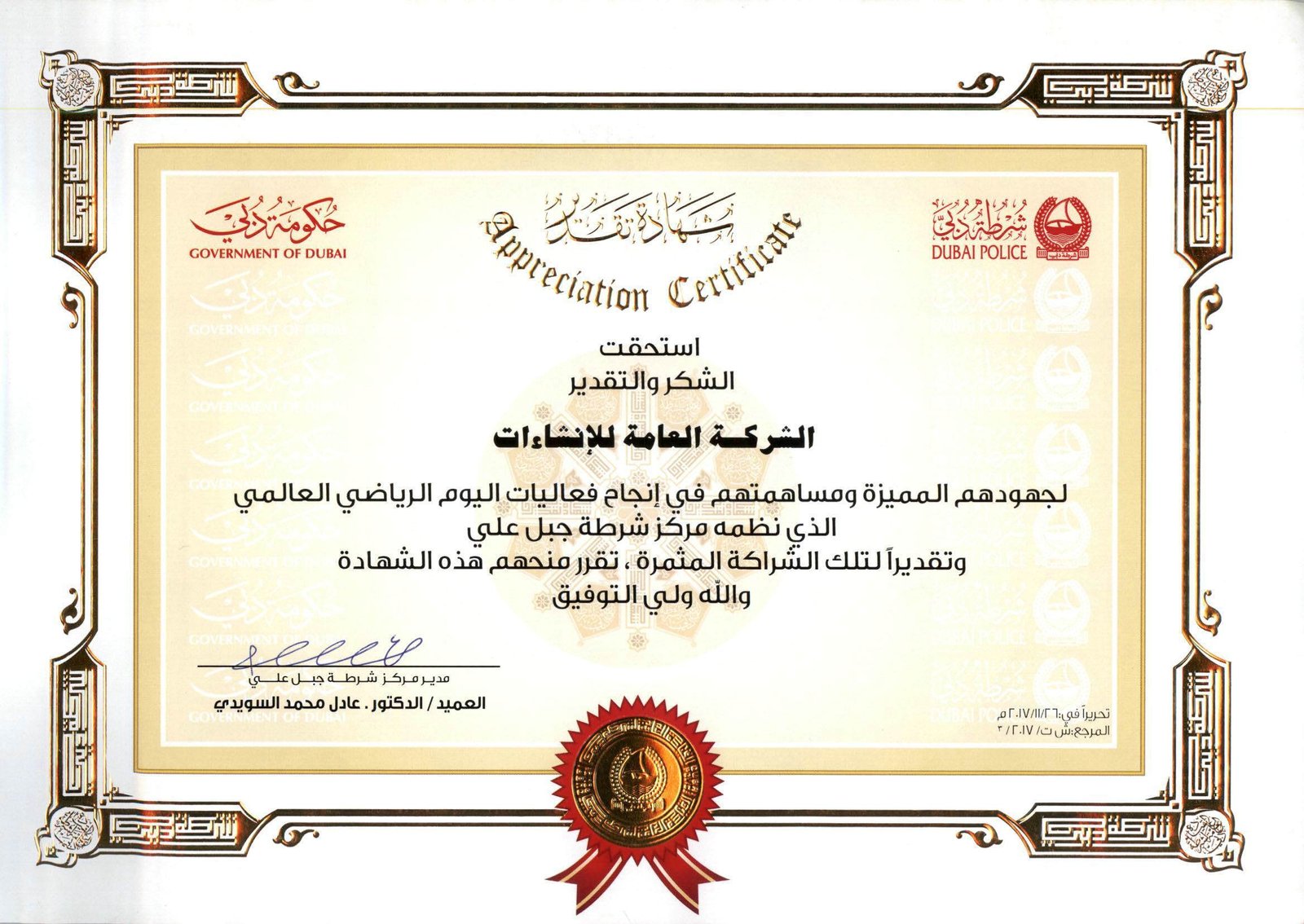 Dubai police- Certificate of Appreciation